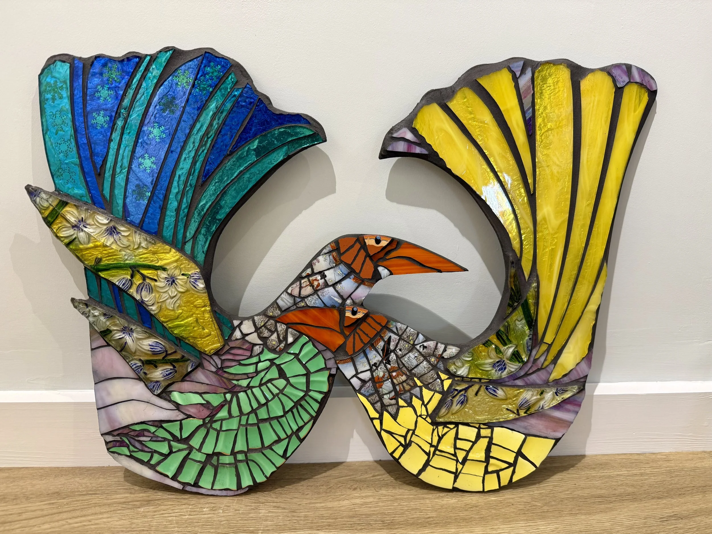 Annie makes brightly coloured and intricate mosaics, using coloured glass and old china, the patterns on which she cleverly weaves into her designs.